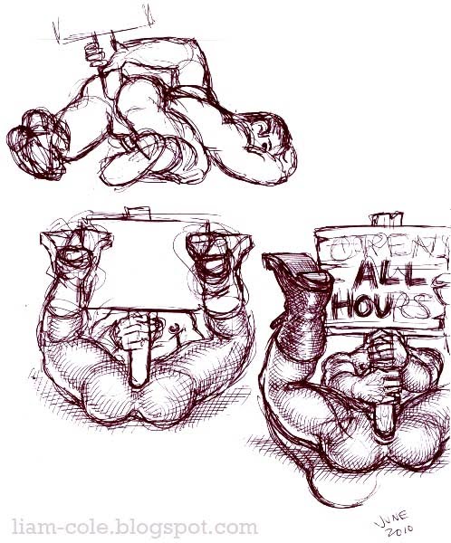 About a month ago I received an email from a guy in Australia who wanted to get a tattoo of one of my doodles. He’d chosen one with a guy who’s stuck a sign in his ass that reads “OPEN ALL HOURS” because he wanted the tattoo to “show everyone that I’m a total slut”. I thought this was a great idea, and we talked about getting the tattoo session on video so I could put it on my next dvd. I also offered to make adjustments to the drawing so that he could choose exactly how he wanted it to look.