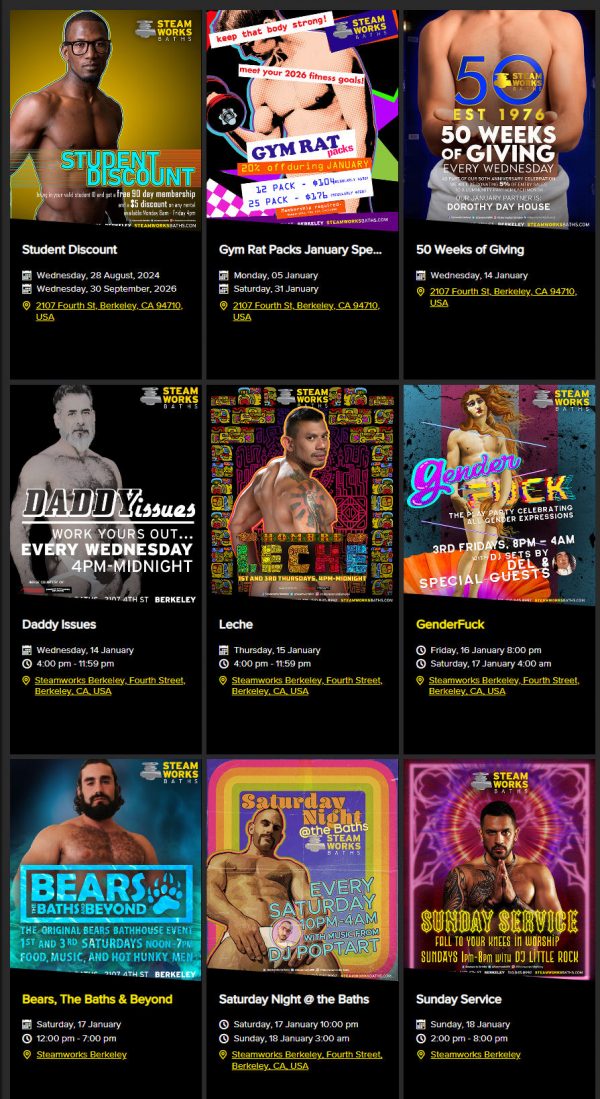 Steamworks is located at 2107 4th Street, Berkeley, CA 94710. The club is ALWAYS OPEN.