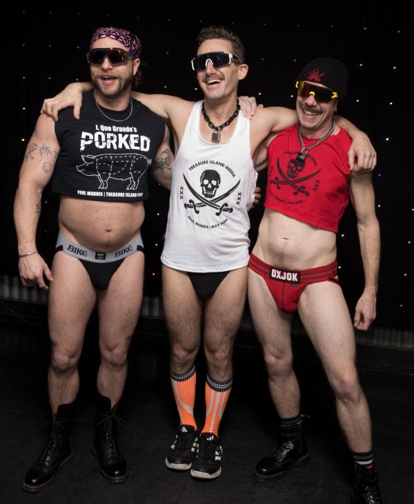 For this ’80s leather-bar themed party, you can gear up…or strip down to your birthday suit like these hot Cruise/Disco go go men.